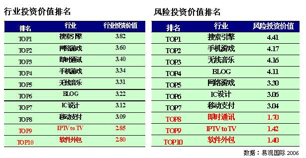 3G 牌照的發(fā)放,手機(jī)游戲、無線音樂、移動支付、博客等行業(yè)投資潛力都將有所提高,其中手機(jī)游戲、無線音樂和博客分別列居第二、第三、第四,成為未來三年中高增長行業(yè)。即時通訊行業(yè)投資價(jià)值排名第三,由于其商業(yè)模式的低創(chuàng)新,致使其風(fēng)險(xiǎn)投資價(jià)值僅為倒數(shù)第三,不具備風(fēng)險(xiǎn)投資價(jià)值。隨著汽車行業(yè)、消費(fèi)電子行業(yè)逐步向智能化、數(shù)字化發(fā)展,IC