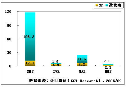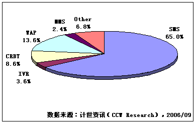 計世資訊(CCW Research)數(shù)據(jù)顯示,2006年第二季度,移動增值業(yè)務市場規(guī)模達到182億元人民幣,移動增值業(yè)務指依托移動通信網(wǎng)絡所提供的基本服務而開展的增值數(shù)據(jù)業(yè)務服務,市場規(guī)模包括移動運營商和服務提供商(SP)收入。其中SMS、IVR、CRBT、WAP和MMS市場規(guī)模分別為118.3、6.5、15.7、24.8和4.4億元人民幣,其他移動增值業(yè)務市場規(guī)模12.3億元人民幣,包括JAVA、BREW、移動定位等業(yè)務。