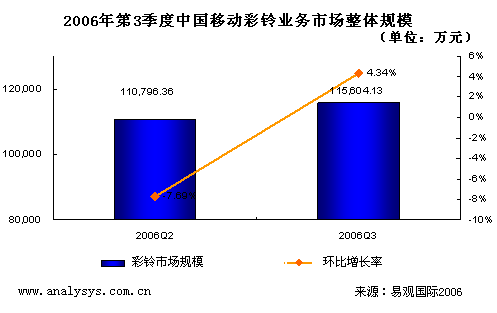 研究表明,2006年第3季度,CRBT業(yè)務(wù)略有反彈。其中移動(dòng)彩鈴業(yè)務(wù)的分帳前信息費(fèi)接近16000萬元,較上個(gè)季度小幅度反彈2.6%。但是總體上仍然呈現(xiàn)徘徊態(tài)勢,并沒有走出低級飽和區(qū)。