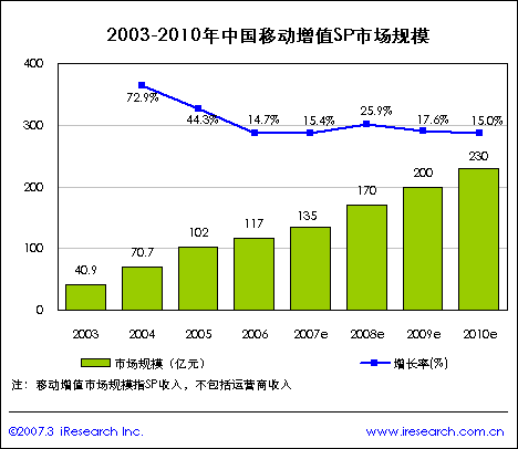 中國移動(dòng)增值服務(wù)從其產(chǎn)生開始,便因其服務(wù)的多樣性和個(gè)性化而受到廣大用戶的歡迎,市場規(guī)模增長非常迅速。大眾移動(dòng)增值業(yè)務(wù)市場是一塊增長快速、極具吸引力的沃土,以短信為代表的移動(dòng)增值業(yè)務(wù)正在為移動(dòng)運(yùn)營商和服務(wù)、服務(wù)提供商(SP)創(chuàng)造更多的收入,而WAP/MMS/Java等2.5G業(yè)務(wù)也將從2007年開始進(jìn)入高速發(fā)展階段。