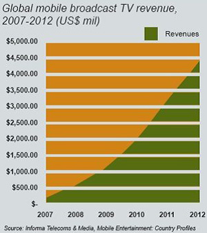 根據(jù)市場研究公司Informa Telecoms &Media的調(diào)查數(shù)據(jù)顯示,移動電視市場在韓國、意大利和美國市場帶動下,將在2007年達到美金2.19億元;至2012年,移動電視市場預(yù)計能產(chǎn)生美金44億元的收益,而美國將成為最大的單一市場,占有全球20%的收益。Informa甚至認為在2009年,美國就可超越韓國,成為移動電視最大的單一市場。