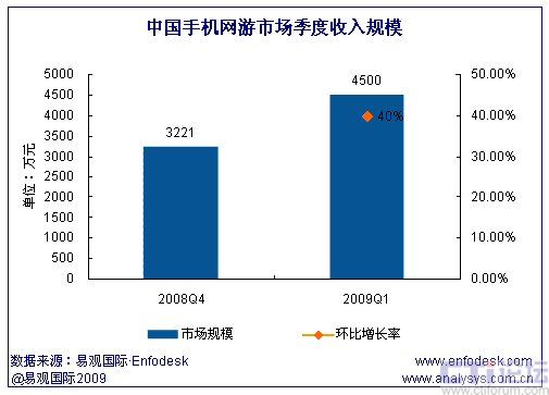 2009年第1季度中國手機網(wǎng)游市場規(guī)模為4500萬元