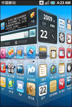 由于OMS是在基于Linux的Andriod系統(tǒng)基礎(chǔ)上,針對(duì)中國市場需求以及中國移動(dòng)的自有業(yè)務(wù)所做的修改,OMS操作系統(tǒng)看上去第一直觀感受仍然是與iPhone界面和T-Mobile推出的第一款A(yù)ndriod手機(jī)“Gphone”界面非常相似。
