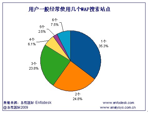 而從用戶最經(jīng)常使用的個數(shù)的調(diào)研中發(fā)現(xiàn),超過1/3的移動搜索用戶最經(jīng)常使用的WAP搜索僅為1個,此類用戶的忠誠度較高,一般對于使用的這一個WAP搜索站點的品牌較為認(rèn)可,因而促使習(xí)慣性使用。而經(jīng)常使用2個或3個WAP搜索站點的用戶均有1/4。經(jīng)常使用超過4個的WAP搜索站點的用戶比例較小。易觀國際(Analysys