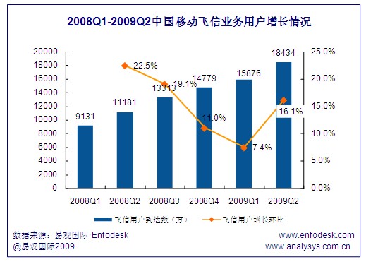 截至2009年第2季度,中國移動(dòng)飛信用戶到達(dá)數(shù)達(dá)1.84億,環(huán)比增長16.1%,與2008年第2季度的1.12億用戶到達(dá)數(shù)相比同比增長64.9%,可見飛信用戶規(guī)模增長的速度十分迅速,究其原因一方面在于飛信運(yùn)營商不遺余力的多渠道營銷宣傳,另一方面在于飛信用戶的口碑傳播,由于用戶規(guī)模的增長帶來更多用戶嘗試體驗(yàn)飛信業(yè)務(wù)。