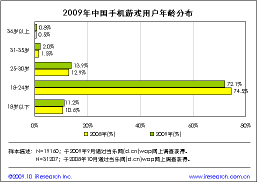 當(dāng)樂網(wǎng)調(diào)研數(shù)據(jù)顯示,2009年手機(jī)游戲用戶群體仍以年輕群體為主體,其中18-24歲的用戶占比為72.1%,較去年下降2.4個(gè)百分點(diǎn)。與去年相比,25歲以上及18歲以下的手機(jī)游戲用戶群體占比均出現(xiàn)一定程度的增長(zhǎng)。25歲以上用戶群體的增長(zhǎng)表明手機(jī)游戲用戶群體正在由年輕群體向成熟群體擴(kuò)展。與此同時(shí),手機(jī)終端作為新的游戲媒體形式對(duì)18歲以下的青少年群體具有較強(qiáng)的吸引力。