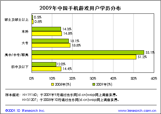 當(dāng)樂網(wǎng)調(diào)研數(shù)據(jù)顯示,2009年手機(jī)游戲用戶中高中(含中專、職高)部分的比例較2008年有所增長(zhǎng),增長(zhǎng)幅度達(dá)3.9個(gè)百分點(diǎn),其余各學(xué)歷階段的用戶比例則均出現(xiàn)不同程度的下降。
