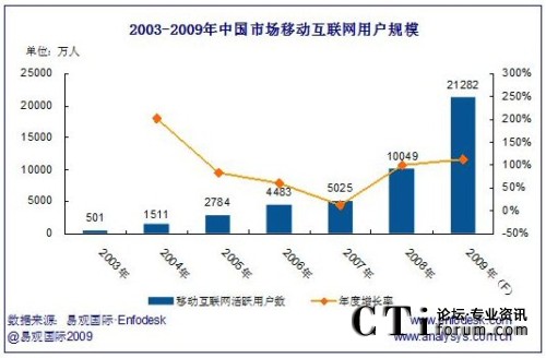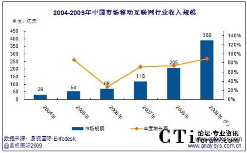 2009年中國市場移動互聯(lián)網(wǎng)行業(yè)收入規(guī)模將達388億,年增長率達111.78%。