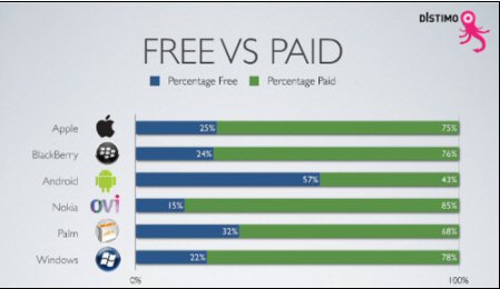 業(yè)內(nèi)人士認(rèn)為,之所以出現(xiàn)這種情況,或許是因為谷歌最早只面向免費(fèi)應(yīng)用開放Android應(yīng)用商店,后來才允許開發(fā)人員推出付費(fèi)應(yīng)用。蘋果和黑莓的免費(fèi)應(yīng)用比例比較接近,分別為25%和24%。此外,Palm的這一比例為32%,Windows