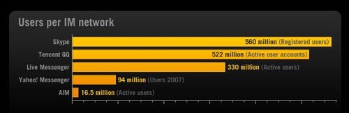 用戶(hù)最多的即時(shí)通訊工具包括:Skype(5.6億注冊(cè)用戶(hù))、騰訊QQ(5.22億活躍用戶(hù)帳戶(hù))、MSN(3.3億活躍用戶(hù))、雅虎通(9400萬(wàn)用戶(hù)--2007年數(shù)據(jù))。
