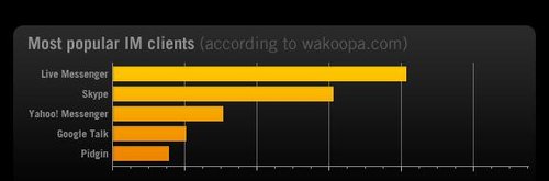 根據(jù)wakoopa.com的數(shù)據(jù),全球最受歡迎的即時(shí)通訊客戶(hù)端依次為:MSN、Skype、雅虎通、GTalk、Pidgin。