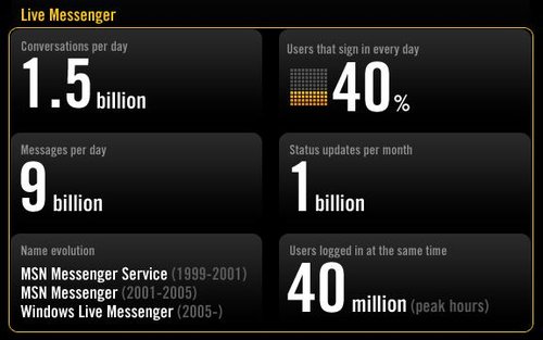 關(guān)于微軟MSN的數(shù)據(jù)為:每天產(chǎn)生的溝通次數(shù)為15億,每天產(chǎn)生的消息為90億條。每月簽名檔消息更新量為10億條。每天都登陸的用戶(hù)比例為40%,同時(shí)在線人數(shù)最高值為4000萬(wàn)。