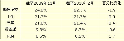 在截至2010年2月的三個(gè)月內(nèi),全美13歲及以上年齡的手機(jī)注冊用戶為2.34億人,摩托羅拉位居第一,市場份額達(dá)到22.3%,LG排名第二,市場份額為21.7%,其次分別為三星(21.4%)、諾基亞(8.7%)和RIM(8.2%)。