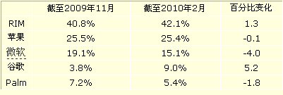 以下為各大智能手機(jī)平臺(tái)截至2009年11月的三個(gè)月平均市場份額與截至2010年2月的三個(gè)月平均市場份額對比: