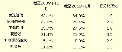 以下為各類移動(dòng)內(nèi)容截至2009年11月的三個(gè)月平均使用比例與截至2010年2月的三個(gè)月平均使用比例對比: