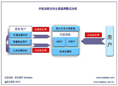根據(jù)Enfodesk易觀智庫(kù)近期發(fā)布的《中國(guó)手機(jī)支付市場(chǎng)系列專題報(bào)告2010——近距支付》報(bào)告顯示,手機(jī)近距支付的主要盈利模式只有三種:即前向用戶服務(wù)費(fèi)、結(jié)算手續(xù)費(fèi)和后向商戶服務(wù)費(fèi)。