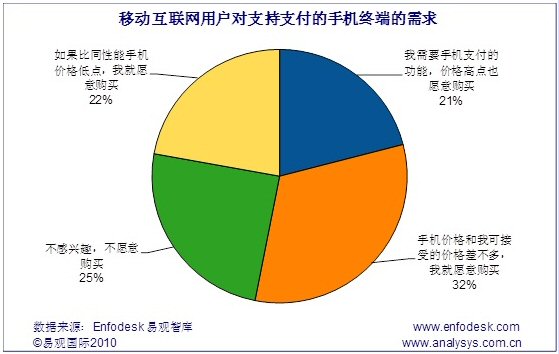 據(jù)Enfodesk易觀智庫(kù)最新報(bào)告《中國(guó)移動(dòng)互聯(lián)網(wǎng)市場(chǎng)用戶研究報(bào)告2010》研究發(fā)現(xiàn),目前在移動(dòng)互聯(lián)網(wǎng)用戶中,有75%的用戶對(duì)具有移動(dòng)支付功能的手機(jī)表現(xiàn)出明顯的興趣,其中影響不大,完全靠性價(jià)比決定是否購(gòu)買的用戶占比最多,約為32%,只有在移動(dòng)具備支付功能的手機(jī)和可接受價(jià)格相近時(shí)才會(huì)購(gòu)買。另外21%的人由于對(duì)移動(dòng)支付業(yè)務(wù)需求程度較高,愿意為此付出更高價(jià)格,其他22%的用戶則在比同性能手機(jī)價(jià)格低些之后,才會(huì)進(jìn)行消費(fèi)。除此之外,還有25%的用戶對(duì)于具備支付功能的手機(jī)沒(méi)有絲毫興趣,不愿意購(gòu)買。
