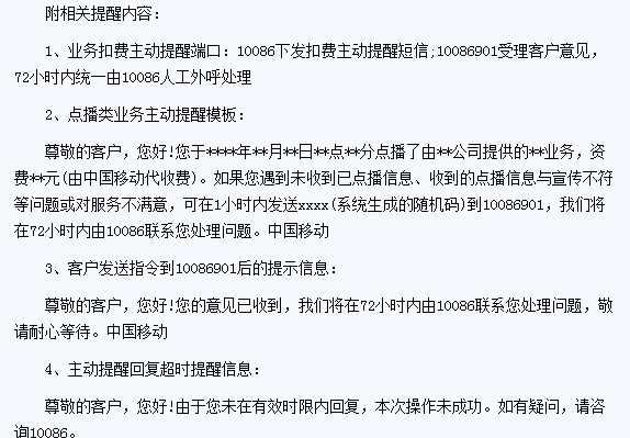 四川移動(dòng)表示,將于今天完成系統(tǒng)改造和上線點(diǎn)播類業(yè)務(wù)的扣費(fèi)主動(dòng)提醒功能。為此,四川移動(dòng)給各大SP廠商下達(dá)了通知,并附上了提醒內(nèi)容。從9月1日期,10086對于用戶開通的業(yè)務(wù)將會(huì)下發(fā)扣費(fèi)主動(dòng)提醒短信。此外,中國移動(dòng)10086901將受理客戶意見,在72小時(shí)內(nèi)統(tǒng)一由10086人工外呼處理。對于用戶開通的點(diǎn)播類業(yè)務(wù),中國移動(dòng)設(shè)置了“點(diǎn)播類業(yè)務(wù)主動(dòng)提醒模板”不僅提醒用戶開通了點(diǎn)播類業(yè)務(wù)還為用戶點(diǎn)播過程中出現(xiàn)的問題給出了解決途徑。