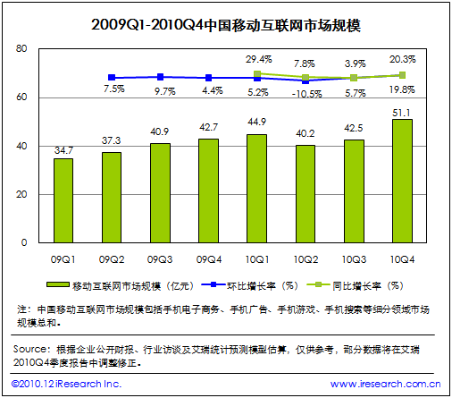 根據(jù)艾瑞咨詢即將發(fā)布的2010年第四季度中國(guó)移動(dòng)互聯(lián)網(wǎng)市場(chǎng)監(jiān)測(cè)數(shù)據(jù)顯示,2010Q4中國(guó)移動(dòng)互聯(lián)網(wǎng)市場(chǎng)整體規(guī)模達(dá)到51.1億,同比增長(zhǎng)19.8%,環(huán)比增長(zhǎng)20.3%。艾瑞咨詢分析認(rèn)為,本季度電信運(yùn)營(yíng)商對(duì)計(jì)費(fèi)通道治理開(kāi)始收尾,移動(dòng)增值市場(chǎng)整體復(fù)蘇。同時(shí)手機(jī)電子商務(wù)、手機(jī)游戲業(yè)務(wù)領(lǐng)域取得良好市場(chǎng)表現(xiàn),受手機(jī)應(yīng)用商店、位置簽到服務(wù)等新型手機(jī)業(yè)務(wù)創(chuàng)新的帶動(dòng),移動(dòng)互聯(lián)網(wǎng)規(guī)模總體攀升,投融資比重增加。