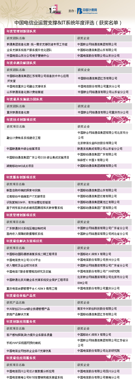 由中國(guó)計(jì)費(fèi)網(wǎng)(www.billingchina.com)主辦的“Awards2010”第四屆中國(guó)電信業(yè)運(yùn)營(yíng)支撐&IT系統(tǒng)年度評(píng)選活動(dòng)的結(jié)果于2011年元月31日隆重揭曉。自2010年12月1日評(píng)選活動(dòng)正式啟動(dòng)以來,歷時(shí)兩個(gè)月,來自國(guó)內(nèi)運(yùn)營(yíng)商集團(tuán)、省級(jí)公司、IT產(chǎn)品與服務(wù)提供商的42家企業(yè)的優(yōu)秀產(chǎn)品、項(xiàng)目和團(tuán)隊(duì)共計(jì)70份參評(píng)項(xiàng)目入圍評(píng)選。經(jīng)過全面征集、選拔、初審以及評(píng)委團(tuán)的嚴(yán)格評(píng)審,評(píng)選結(jié)果已經(jīng)公示。在30位來自運(yùn)營(yíng)商IT支撐、業(yè)務(wù)和服務(wù)部門的威權(quán)評(píng)委們的認(rèn)真評(píng)審后,共有27家企業(yè)分別獲得了30個(gè)Awards2010的團(tuán)隊(duì)/項(xiàng)目/產(chǎn)品/應(yīng)用服務(wù)的榮譽(yù)桂冠。