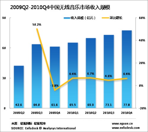 2010年第4季度中國(guó)無(wú)線音樂(lè)市場(chǎng)收入達(dá)77.8億元
