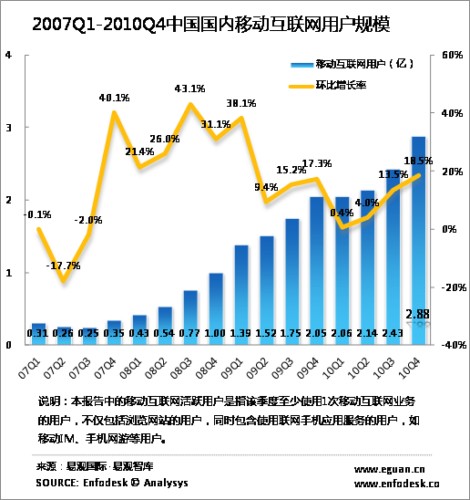 據(jù)Enfodesk易觀智庫最新發(fā)布的數(shù)據(jù)顯示,2010年第4季度中國國內(nèi)移動互聯(lián)網(wǎng)用戶規(guī)模達(dá)2.88億人,環(huán)比增長18.52%,相比去年同期呈現(xiàn)41.48%的增長速度。
