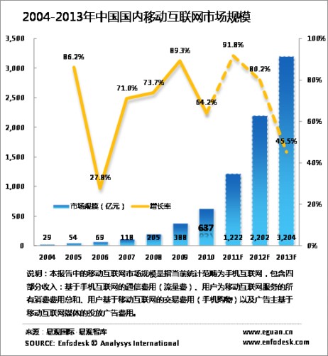 2010年中國國內(nèi)移動互聯(lián)網(wǎng)市場規(guī)模達(dá)到637億元,較2009年上漲64.2%,增速放緩。除去流量費之外,移動互聯(lián)網(wǎng)服務(wù)收入達(dá)到342億元。