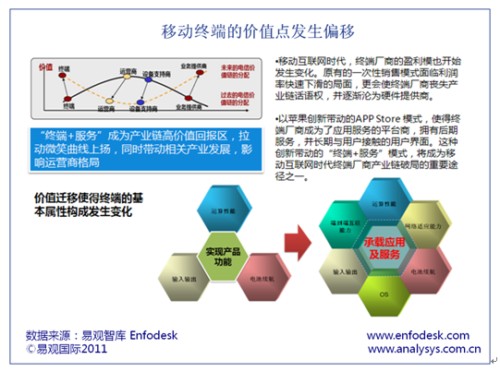 易觀智庫Enfodesk在近期發(fā)布《中國移動互聯(lián)網市場年度綜合報告2011》中認為,隨著3G的普及以及多元化移動應用的出現,智能手機取代功能手機已成定勢,導致傳統(tǒng)的移動終端價值點開始由產品化向服務化遷移。終端廠商原有模式也受到極大挑戰(zhàn)。若不進行有效轉型恐難以在未來2-3年后的手機市場生存。