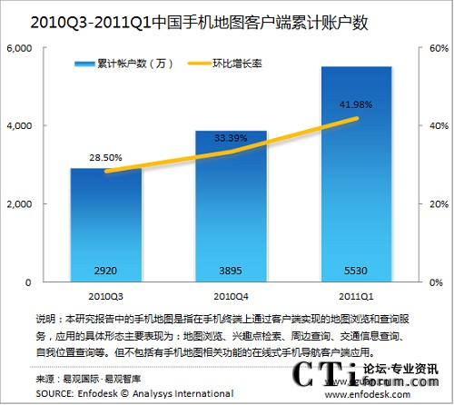 2011年第1季度中國手機(jī)地圖客戶端累計(jì)賬戶達(dá)5530萬