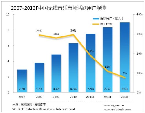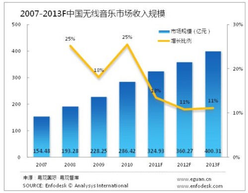 2011年整體無線音樂市場格局仍會保持相對穩(wěn)定。但整體市場規(guī)模,及無線音樂用戶數(shù)的增速會略有下降。易觀國際(Analysys International)預計2013年收入規(guī)模達到400個億,2013年無線音樂活躍用戶達到9.95億人。
