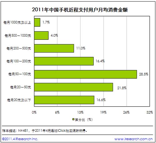 根據(jù)艾瑞咨詢近期發(fā)布的《2011年中國新興線下支付行業(yè)研究報(bào)告》的研究數(shù)據(jù)顯示,中國手機(jī)支付發(fā)生的場景主要集中在超市、便利店和商場等場所;并且,目前的中國用戶的手機(jī)支付金額,都以100元及以下的小額支付為主。