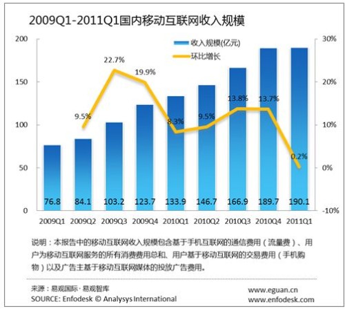 2011年第1季度國內(nèi)移動互聯(lián)網(wǎng)收入達(dá)190億元