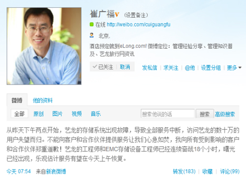 7月12日上午消息,因遭遇存儲故障,從昨日下午2時起,提供在線服務的旅游網(wǎng)站藝龍開始無法訪問,截至目前已經(jīng)過去了20個小時。藝龍CEO崔廣福通過新浪微博表示,藝龍工程師和EMC存儲工程師正在緊張搶修中,預計今天上午能夠恢復正常。新浪科技