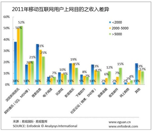 對于不同收入的用戶,其上網(wǎng)目的也有一定程度的不同,隨著收入的上升,瀏覽新聞資訊的需求明顯增加,即時通訊需求有所下滑,同時5000元以上收入的用戶對股票金融、收發(fā)郵件的需求有顯著提升。