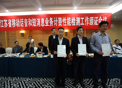 會(huì)上,檢測單位公布了移動(dòng)話音和短消息業(yè)務(wù)計(jì)費(fèi)檢測的相關(guān)標(biāo)準(zhǔn)和本次計(jì)費(fèi)檢測的合格清單。省通信管理局向江蘇電信、江蘇移動(dòng)、江蘇聯(lián)通共39家地市公司頒發(fā)了移動(dòng)話音和短消息業(yè)務(wù)計(jì)費(fèi)性能檢測合格證書。
