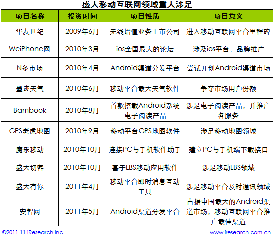 根據(jù)艾瑞咨詢整理的數(shù)據(jù)認為,盛大一向秉持這“產(chǎn)業(yè)布局比產(chǎn)品開發(fā)更重要”的想法,縱觀盛大在幾年中對移動互聯(lián)網(wǎng)的產(chǎn)業(yè)鏈建立,投資及開發(fā)項目可謂是星光奪目。