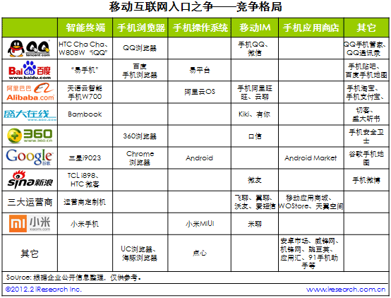 從下表中可看出,騰訊、百度、阿里巴巴、盛大、谷歌、新浪、三大運(yùn)營商和小米科技在移動(dòng)終端硬件和軟件上都有布局,而根據(jù)各家的不同優(yōu)勢,幾乎都有至少一個(gè)用戶量級(jí)、影響力發(fā)展的較好的應(yīng)用軟件,如騰訊的手機(jī)QQ、微信,百度的手機(jī)搜索、手機(jī)地圖,阿里巴巴的手機(jī)淘寶、手機(jī)支付寶,盛大的Bambook、切客,360的手機(jī)安全衛(wèi)士,谷歌的Android系統(tǒng)、Chrome瀏覽器,新浪的手機(jī)微博,三大運(yùn)營商的定制手機(jī),小米的小米手機(jī)、米聊。