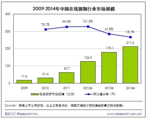 艾瑞最近發(fā)布中國(guó)在線視頻行業(yè)市場(chǎng)監(jiān)測(cè)報(bào)告,報(bào)告顯示, 2011年中國(guó)在線視頻行業(yè)市場(chǎng)規(guī)模62.7億,同比增長(zhǎng)99.9%。受季度性因素影響,2011年第四季度廣告收入減少,市場(chǎng)規(guī)模增長(zhǎng)率80.8%,同比增長(zhǎng)放緩。2012年我國(guó)在線視頻行業(yè)市場(chǎng)規(guī)模將突破百億大關(guān),版權(quán)資源與奧運(yùn)營(yíng)銷將成為競(jìng)爭(zhēng)重點(diǎn)。