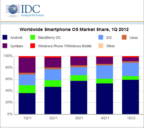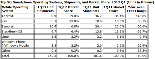 Android和蘋(píng)果的iOS繼續(xù)主導(dǎo)全球智能手機(jī)行業(yè),這兩個(gè)平臺(tái)的總出貨量占到2012年一季度所有智能手機(jī)出貨量的82%。其中Android手機(jī)以8900萬(wàn)臺(tái)占據(jù)整個(gè)行業(yè)出貨量的59%,而蘋(píng)果以3510萬(wàn)臺(tái)的出貨量占據(jù)23%的市場(chǎng)份額。這些數(shù)據(jù)均來(lái)自IDC的最新研究報(bào)告。