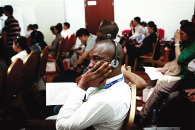 昨日,京交會上,“中國分銷服務(wù)業(yè)企業(yè)走出去”會場,一位外籍嘉賓在認真聽同聲傳譯。新京報記者 孫純霞 攝