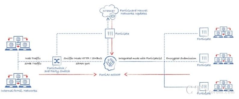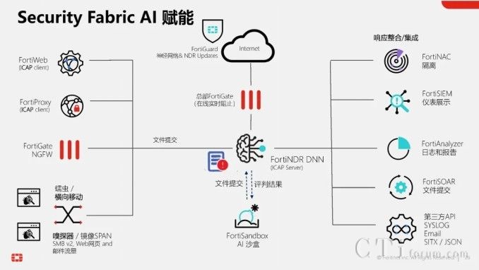 此外,AI技術(shù)還貫穿于Fortinet的多個產(chǎn)品與功能中,形成高效的工作流。以威脅檢測與響應(yīng)為例,當(dāng)FortiGate的雙引擎也無法確定某個文件的合法性時,它可以將該文件提交給FortiNDR進(jìn)行深度分析,利用云端深度神經(jīng)網(wǎng)絡(luò)AI進(jìn)行0 Day攻擊、勒索軟件等深層次分析。若仍無法確定,還可進(jìn)一步提交給FortiSandbox,在虛擬機(jī)環(huán)境中進(jìn)行模擬操作,進(jìn)行更為深入的檢測。在這一系列流程與技術(shù)的支持下,F(xiàn)ortinet的威脅檢測與響應(yīng)能力已達(dá)到業(yè)界頂尖水平,向滿分100分邁進(jìn)。