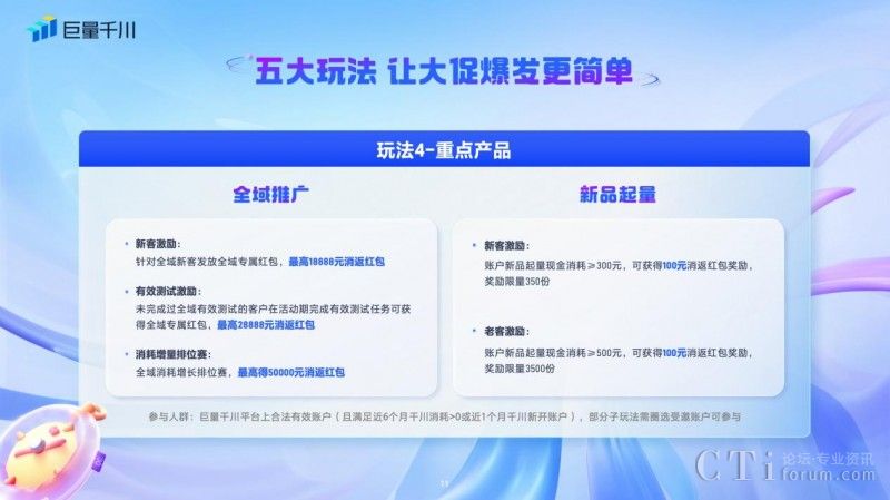 四、「重點(diǎn)產(chǎn)品玩法」:「全域推廣」和「新品起量」兩個(gè)巨量千川平臺(tái)重點(diǎn)產(chǎn)品,也推出了系列玩法。全域推廣對(duì)新客、完成有效測(cè)試的客戶發(fā)放全域推廣專屬紅包,最高達(dá)28888元,參與全域增長(zhǎng)消耗排位賽也可獲得高達(dá)50000元的消返紅包。新品起量基準(zhǔn)期新客現(xiàn)金消耗≥300元,可獲得100元消返紅包獎(jiǎng)勵(lì),老客現(xiàn)金消耗≥500元,即可得到100元消返紅包獎(jiǎng)勵(lì)。