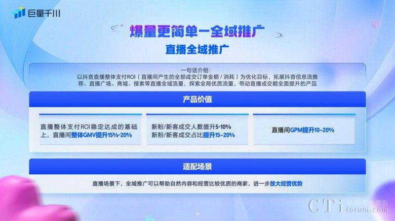 獲取生意增量是商家生意經(jīng)營的重中之重,升級(jí)后的全域推廣分為直播全域推廣和商品全域推廣,讓爆量變得更簡(jiǎn)單。直播全域推廣打通廣告和自然流量,以抖音直播整體ROI為優(yōu)化目標(biāo),拓展抖音信息流推薦、直播廣場(chǎng)、商城、搜索等直播全域流量,帶動(dòng)直播成交額全面提升,放大直播生意,直播間整體GMV提升15%~20%,新客/新粉成交占比提升15%~20%。