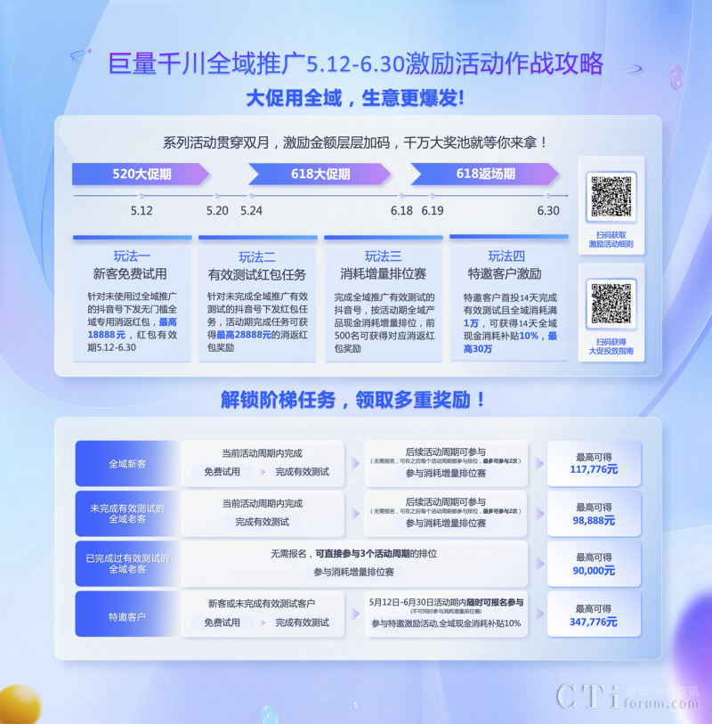 在此次巨量千川618好物節(jié)期間,全域推廣系列活動(dòng)貫穿雙月,激勵(lì)金額層層加碼,更有多重獎(jiǎng)勵(lì),獎(jiǎng)池金額累積千萬。全域推廣針對(duì)全域新客發(fā)放高達(dá)18888元的全域推廣專屬紅包;對(duì)于未完成全域有效測(cè)試的商家在活動(dòng)期完成有效測(cè)試任務(wù)可獲得最高28888元的消返紅包;以及參與全域推廣消耗排位賽,最高可得50000元消返紅包;對(duì)于特邀客戶首投14天完成有效測(cè)試且全域消耗滿1萬,可獲得14天全域現(xiàn)金消耗補(bǔ)貼10%,最高達(dá)30萬。