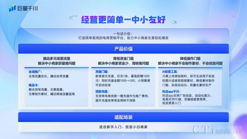 針對(duì)中小商家經(jīng)營長(zhǎng)效問題,巨量千川打造簡(jiǎn)單易用的電商營銷平臺(tái)。撬動(dòng)多元場(chǎng)景流量,解決中小商家獲量難題;降低資金門檻,解決資金少、周轉(zhuǎn)難的問題;降低素材制作操作門檻,解決商家“不會(huì)投”、“不敢投”的難題,讓經(jīng)營更簡(jiǎn)單。