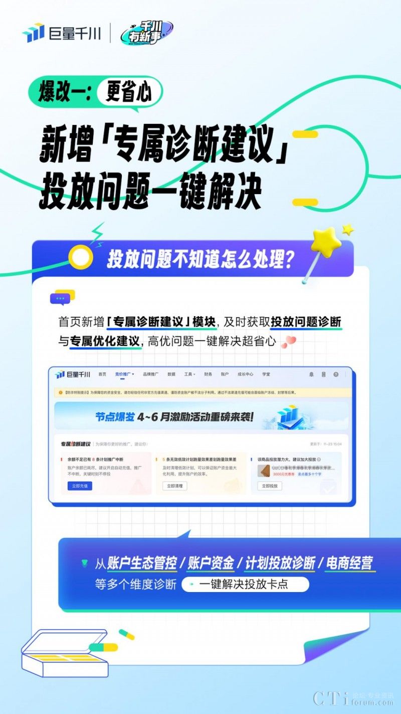 近期,為直面商家投放困境,全面提升投放效率,巨量千川PC端首頁全新推出四大重磅升級——上線「專屬診斷建議」、「數(shù)據(jù)看板」、「重磅產(chǎn)品推薦」和「平臺動態(tài)」,助力商家更便捷、更從容地提升投放質量和效果,高效推動生意增長!