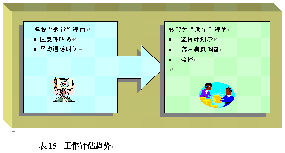 。。這些年呼叫中心工作評估經(jīng)歷了一些變化。最新趨勢是擺脫死板的"數(shù)量"評估,例如回復(fù)呼叫數(shù),通過客戶滿意度調(diào)查和監(jiān)控進行數(shù)量評估以外的更全面的質(zhì)量評估。在表14中指出這種最新的工作評估趨勢的原因是,大量數(shù)量評估,例如回復(fù)呼叫數(shù),實際上已經(jīng)不能使員工在其基礎(chǔ)上進行改善。例如,一個每小時接聽十個呼叫的員工并不比每小時僅接聽五個呼叫的員工效率更高。呼叫中心管理者評估員工工作更好的辦法是在這種數(shù)量評估中加入額外的質(zhì)量評估。