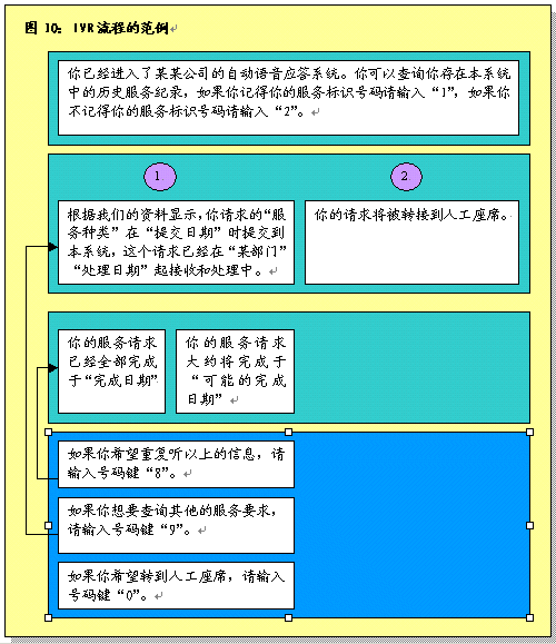 根據(jù)呼叫處理部分所作的說明,在完成初次聯(lián)絡(luò)過程之后,服務(wù)代表將確定呼叫者的需要。之后服務(wù)代表將協(xié)助呼叫者或者使其選擇IVR系統(tǒng),該系統(tǒng)通過自動為這些請求錄音提供相關(guān)的信息和服務(wù)。服務(wù)代表將接受培訓(xùn)識別哪些交易服務(wù)和信息服務(wù)可以通過IVR進(jìn)行,這樣他們可以使呼叫者選擇自我服務(wù)。圖9圖示了用這一辦法處理呼叫的過程。