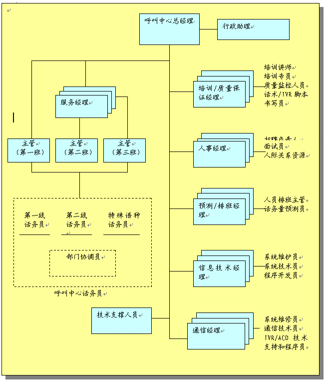 呼叫中心組織結(jié)構(gòu)概述了中心的任務和職責。對組織進行了統(tǒng)籌安排以便中心能有效達到工作目標,組織安排主要有: