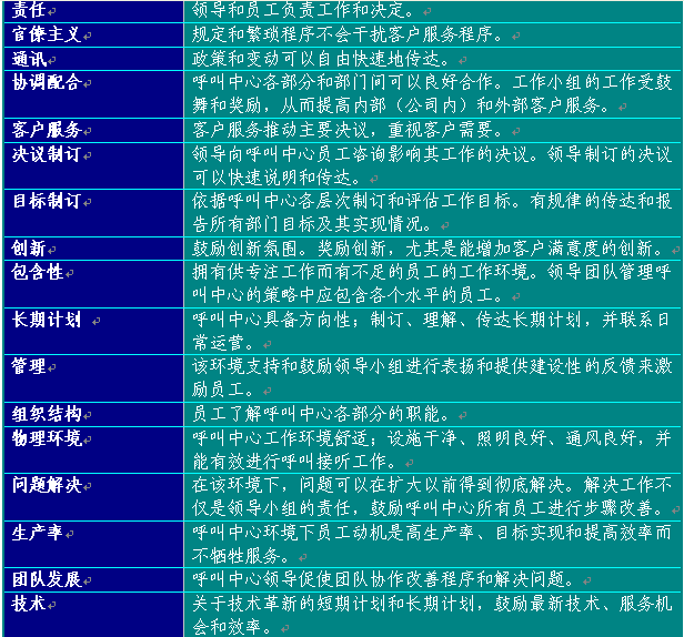 根據(jù)呼叫中心的具體需要,還可以包括許多其他要素。建議在制訂員工滿意度調(diào)查表時(shí)結(jié)合組織人員關(guān)系,組織管理、收集和報(bào)告結(jié)果和趨勢(shì)。這有助于員工確信調(diào)查過程、調(diào)查結(jié)果及其對(duì)今后提高的影響。